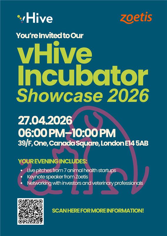 Please join us as we celebrate the successes from the second year of the Veterinary Health Innovation Engine (vHive) Incubator and hear a selection of pitches from a range of cutting edge startups within the programme. Alongside start-up pitches, we are delighted to have a keynote speaker from Zoetis, who will be announced shortly.